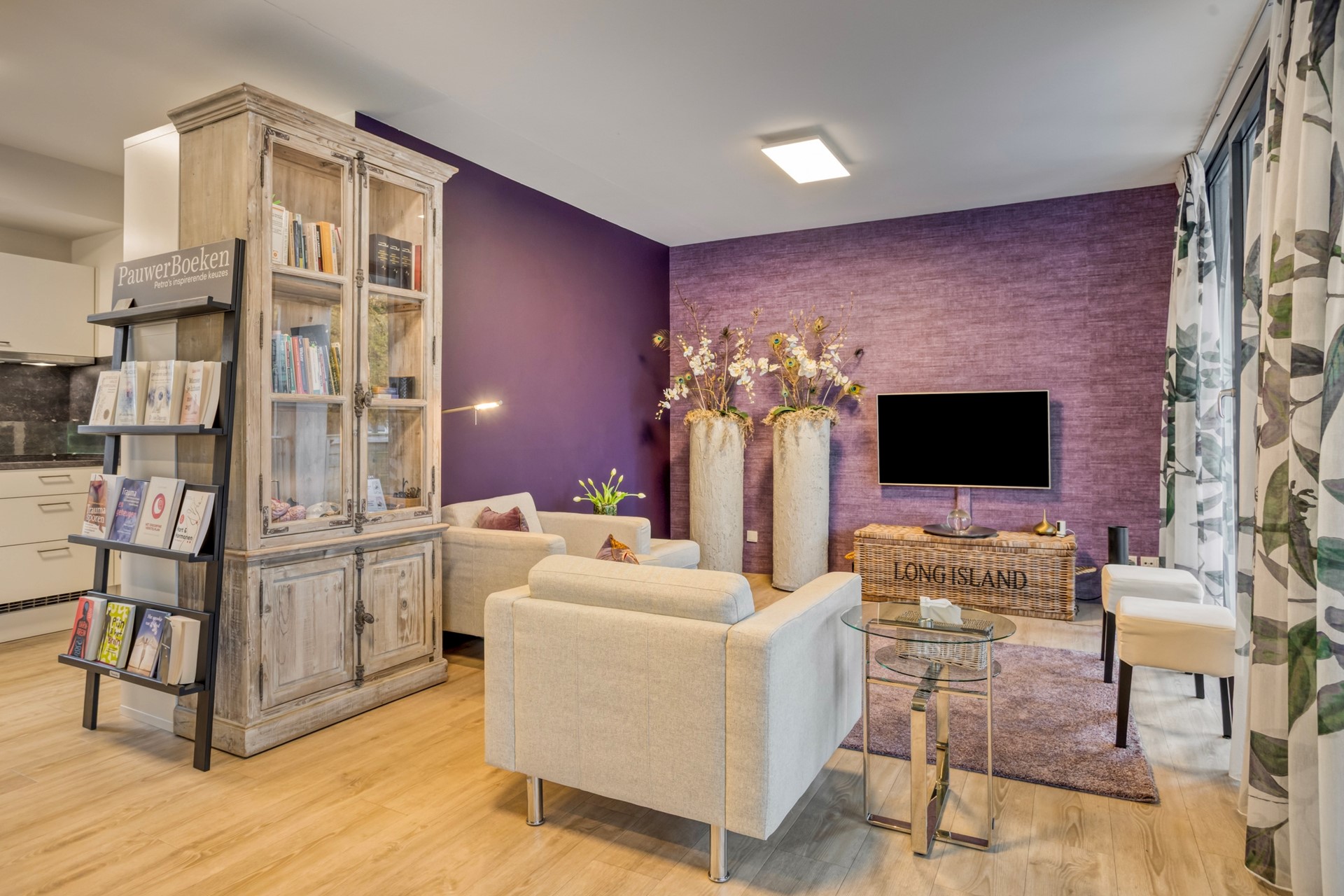 Via de openslaande tuindeuren stap je de woning binnen. Wat direct opvalt is het vele en fijne lichtinval. Dat kan ook niet anders omdat de gehele voorgevel is voorzien van een glaspartij. Je hebt hierdoor ook een super uitzicht. De L-vormige indeling zorgt dat je een ruime zithoek kwijt kunt en een prima eettafel om met vrienden bij te kletsen. Koude voeten zul je hier niet krijgen, want de vrijwel de gehele woning is voorzien van vloerverwarming.