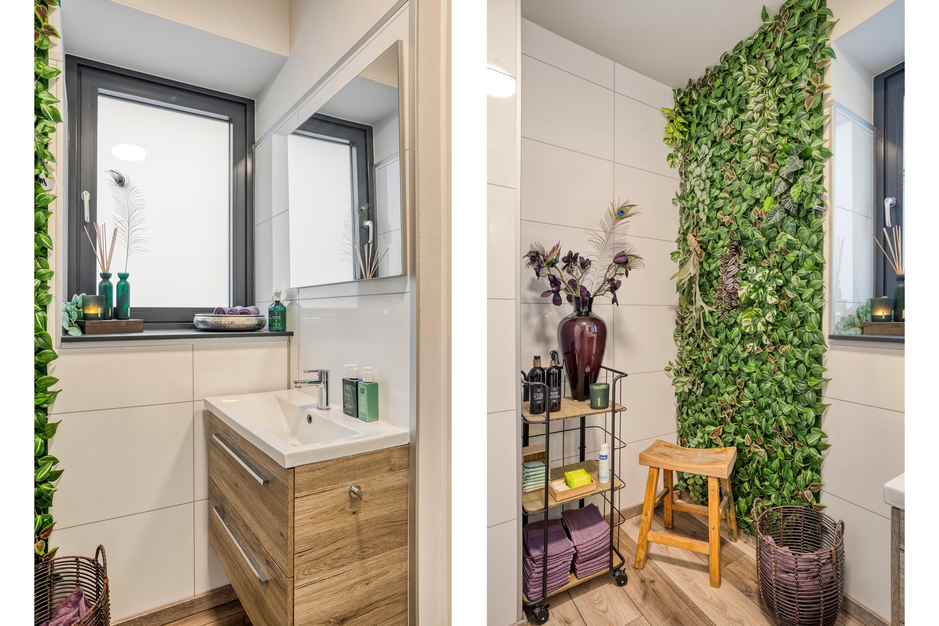 Frisse en moderne badkamer. Via het raam kan zowel het daglicht goed binnenkomen, maar kan ook de badkamer goed worden geventileerd. Met een paar leuke accessoires maak je de badkamer helemaal eigen. Extra praktisch is dat de wasmachine is verstopt in de vaste kast. De oorspronkelijk badkamer is voorzien van o.a.: