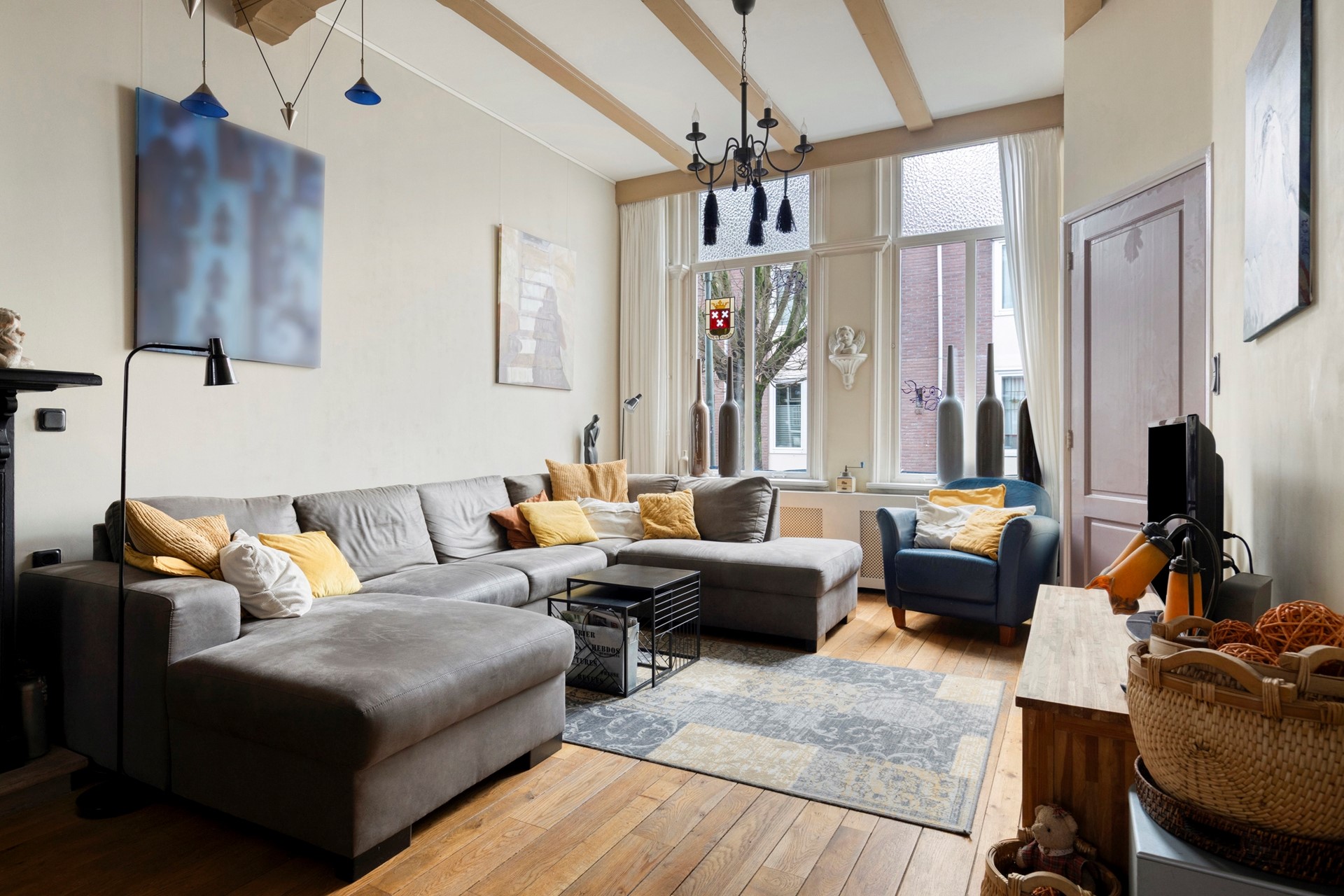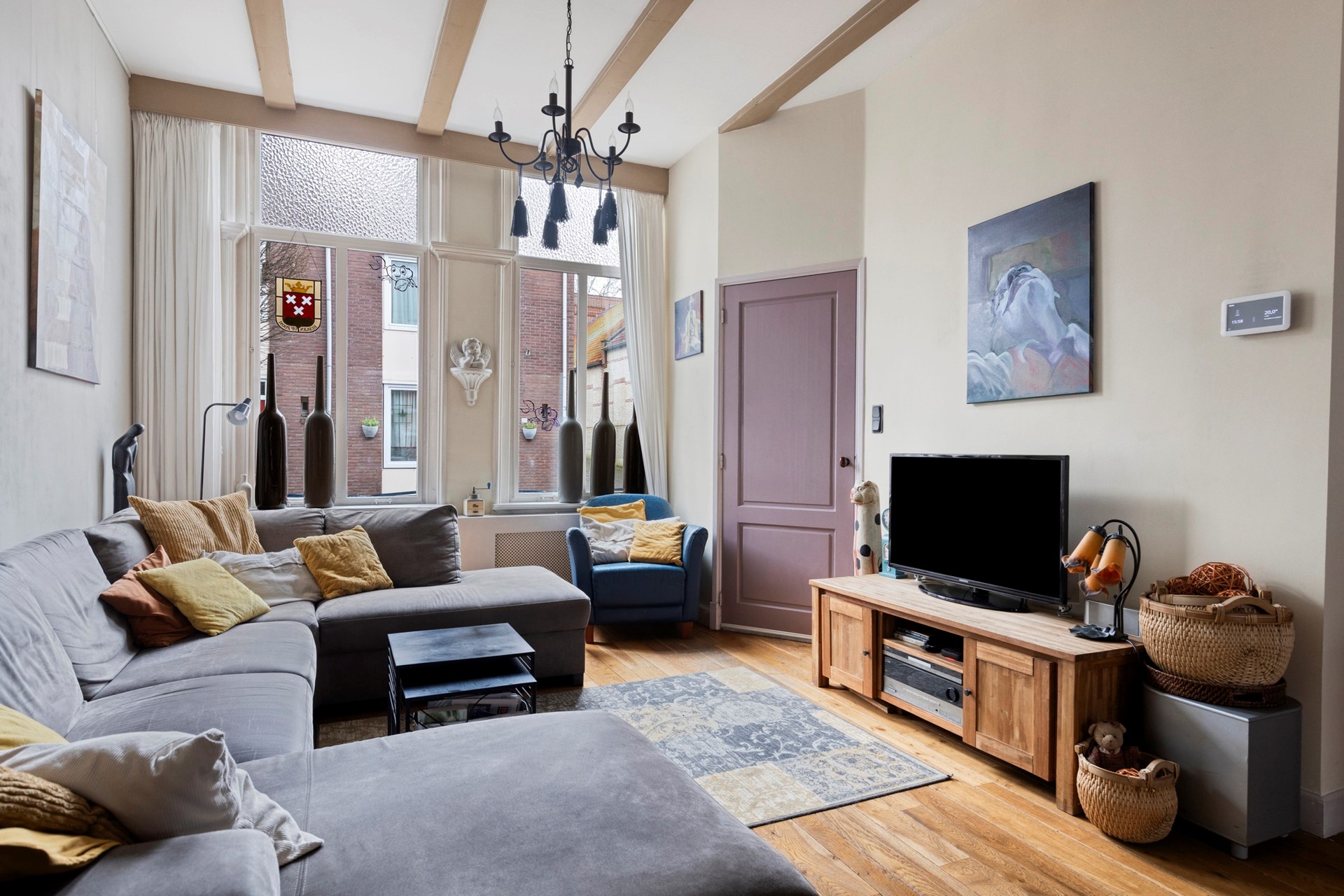 De ruimte is afgewerkt met een houtenvloer, gestuukte wanden en een balken plafond.