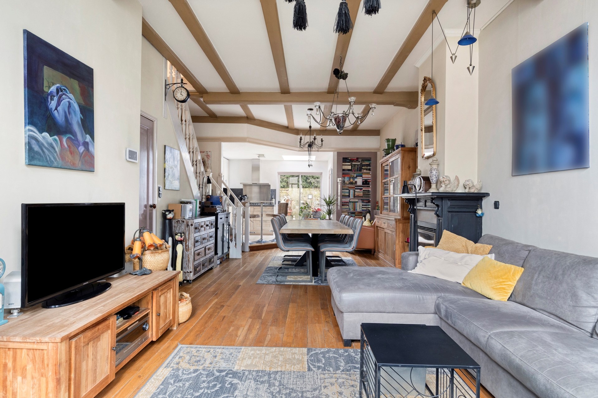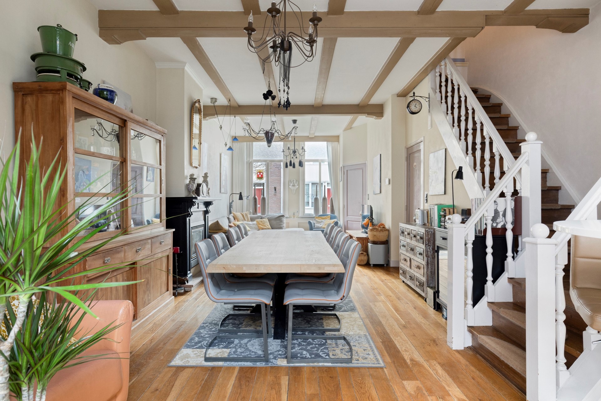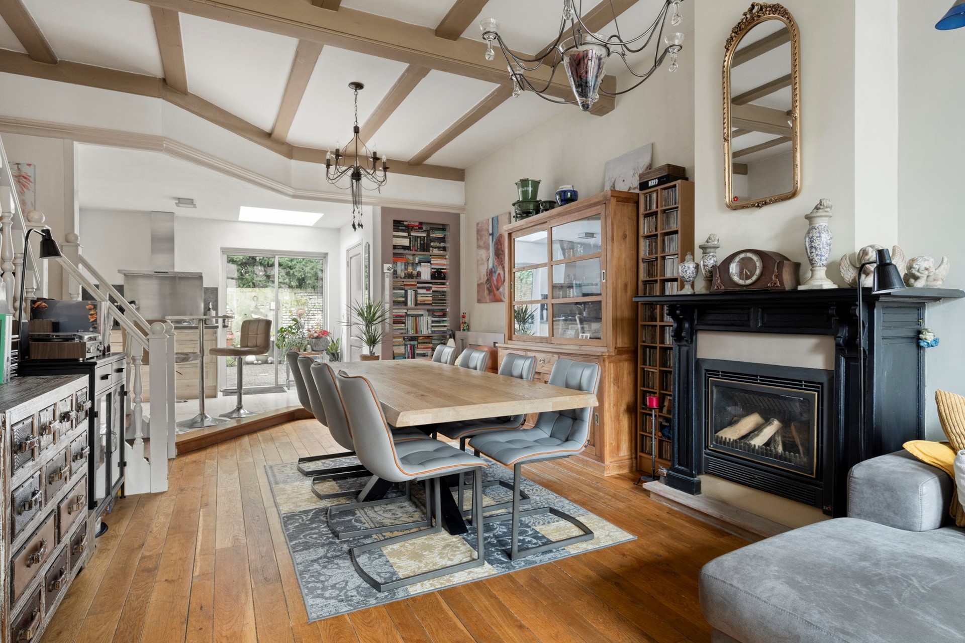 Sfeervolle woonkamer door het aanwezige hoge balkenplafond en de gezellige openhaard met gaskachel. Met ruim 9 meter lengte kun je hier met gemak een royale zit- en eethoek in plaatsen. Een echte familiekamer. De woonkamer staat in open verbinding met de keuken. Daarnaast is er via de stijlvolle trapopgang toegang tot de verdiepingsvloer.