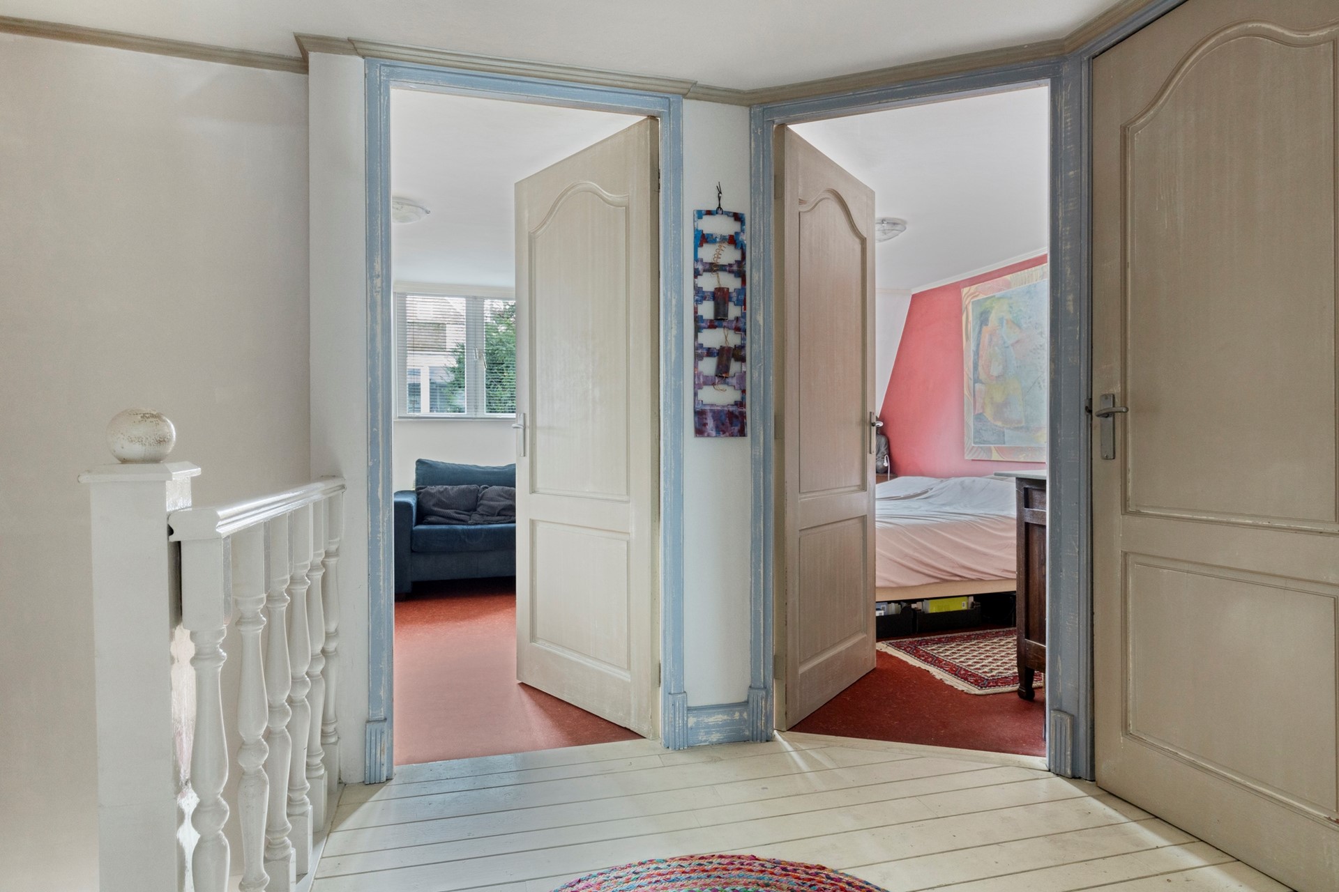 Ruime overloop die toegang geeft tot 2/3-slaapkamers, de badkamer en de vaste trap naar de zolderverdieping. Genoeg ruimte om elkaar te passeren door de handige indeling.