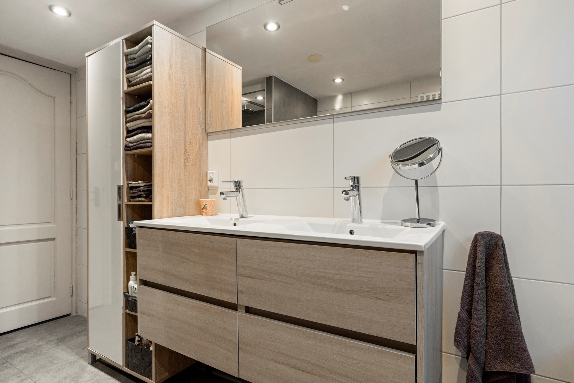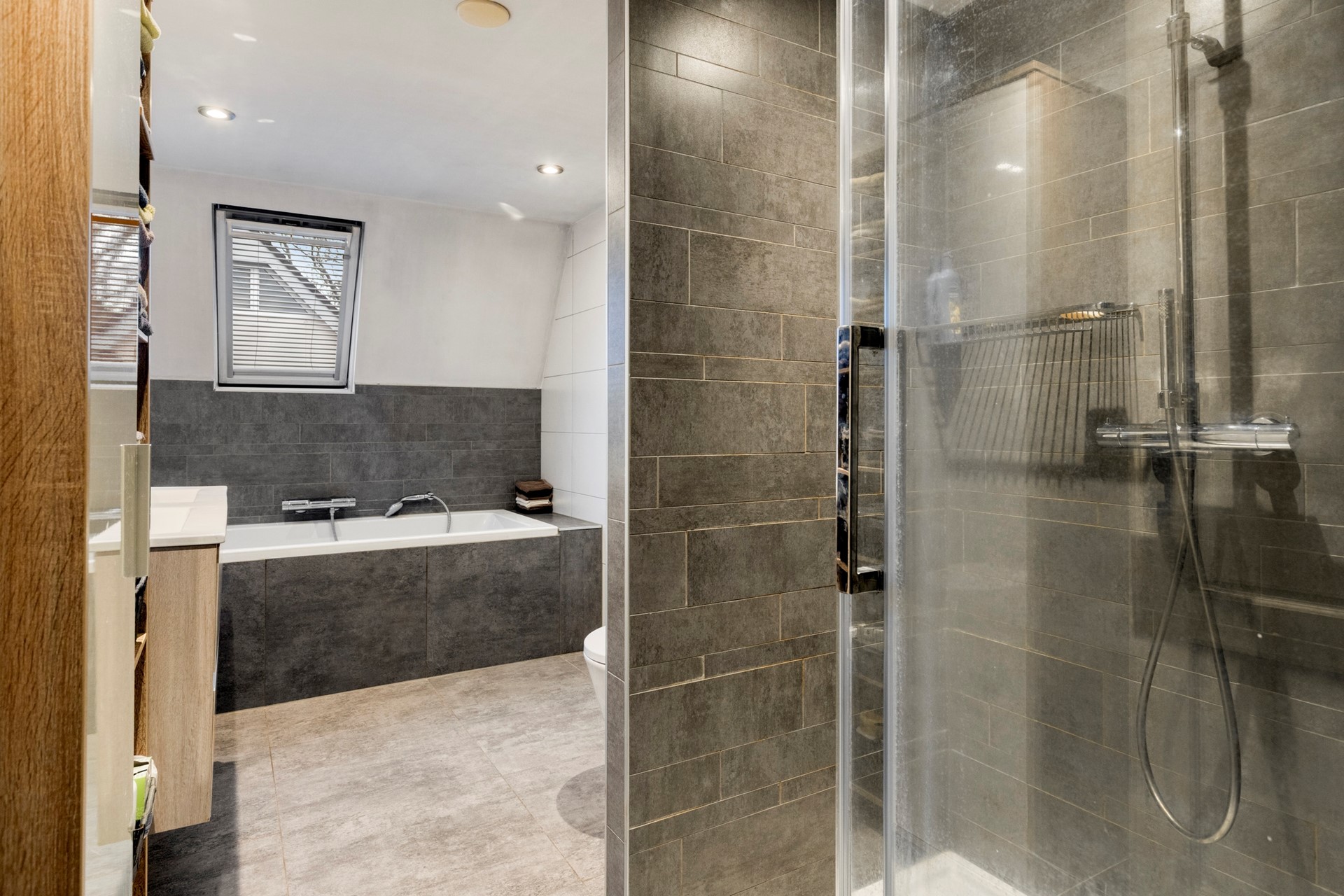 Moderne badkamer in een neutrale kleurstelling. Met een paar leuke accessoires maak je de badkamer helemaal eigen. Via het dakraam kan zowel het daglicht binnenstromen en de ruimte op natuurlijke wijze ventileren. De badkamer is van alle hedendaagse gemakken voorzien, zoals: