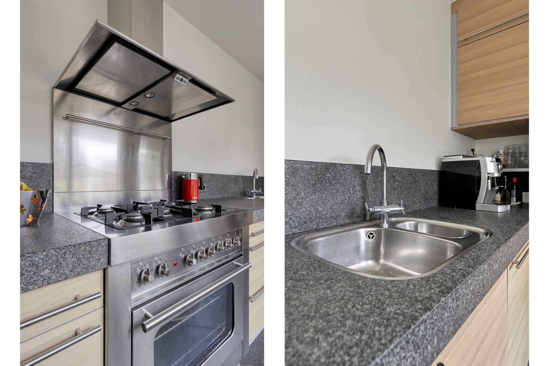 De openkeuken - in hoekopstelling - is super praktisch om de heerlijkste maaltijden in te bereiden. Het is een lichte ruimte door het flinke raampartij en via de achterdeur is er toegang tot de tuin. Het keukenblok heeft een massief natuursteen werkblad en is van alle gemakken voorzien, zoals: