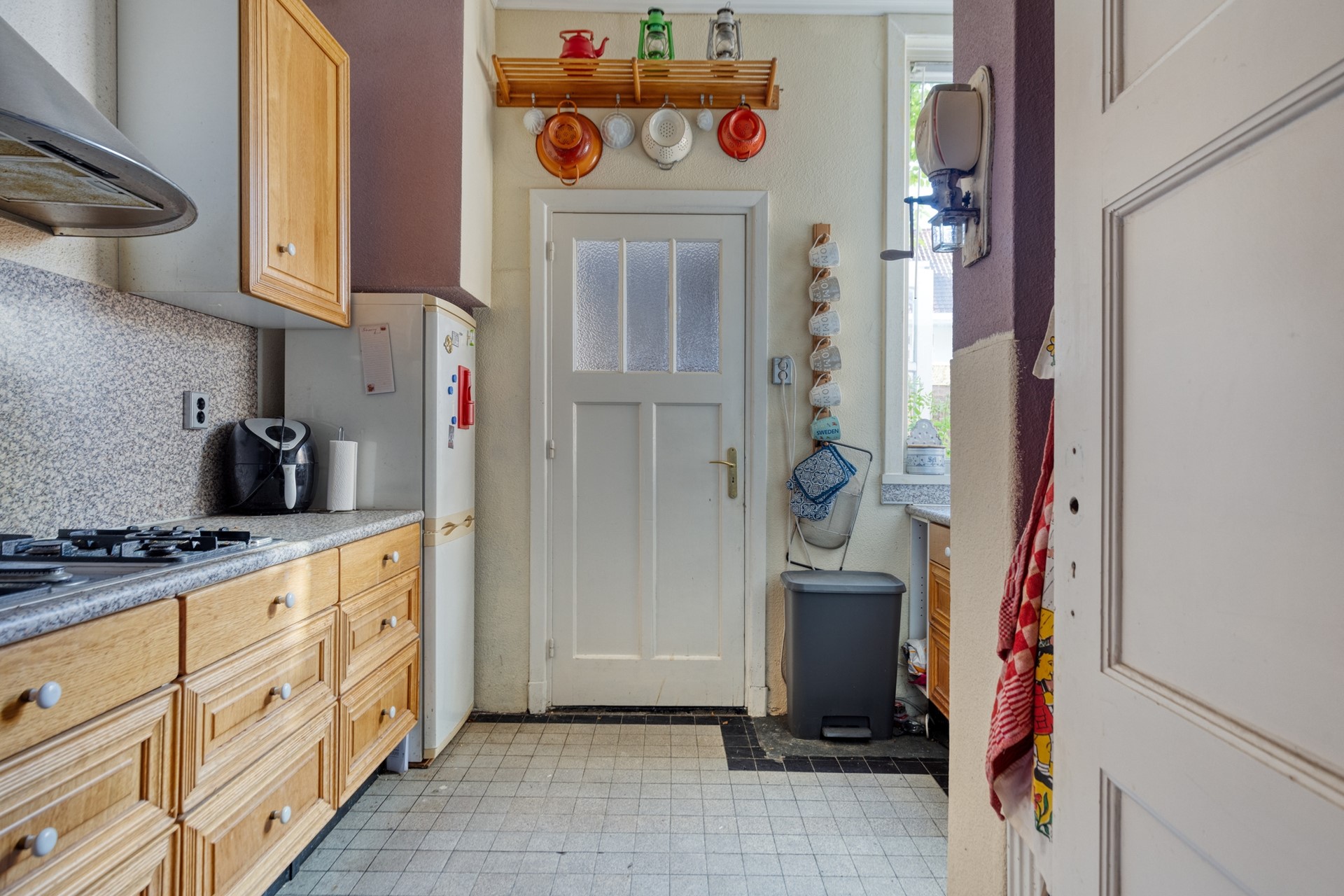 De separate keuken is via de hal te bereiken en is eenvoudig van opzet. De ruimte leent zich uitstekend voor het plaatsen van een droomkeuken met alle handige inbouwapparatuur die je wilt. Via het hoekraam is er zicht op de tuin en kan het daglicht ook de keuken binnenkomen. De keuken geeft toegang tot de bijkeuken en is voorzien van een 5-pits gasfornuis, enkele spoelbak en afzuigkap.