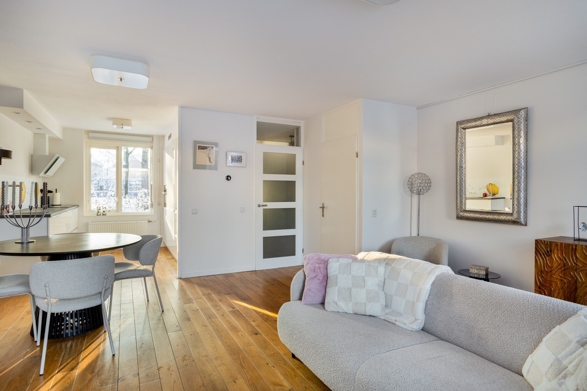 Woonkamer: Heerlijk lichte woonkamer met een geweldig zicht op de achtertuin. Door de schuifpui lijkt de tuin een verlengstuk van de woonkamer, wel zo prettig in de zomermaanden. De woonkamer laat zich heel natuurlijk indelen met een royale zit- en eethoek. De boodschappenvoorraad en stofzuiger kunnen keurig in de trapkast worden geplaatst. De ruimte is afgewerkt met een eikenhoutenvloer, gestuukte wanden en een spuitwerk plafond.