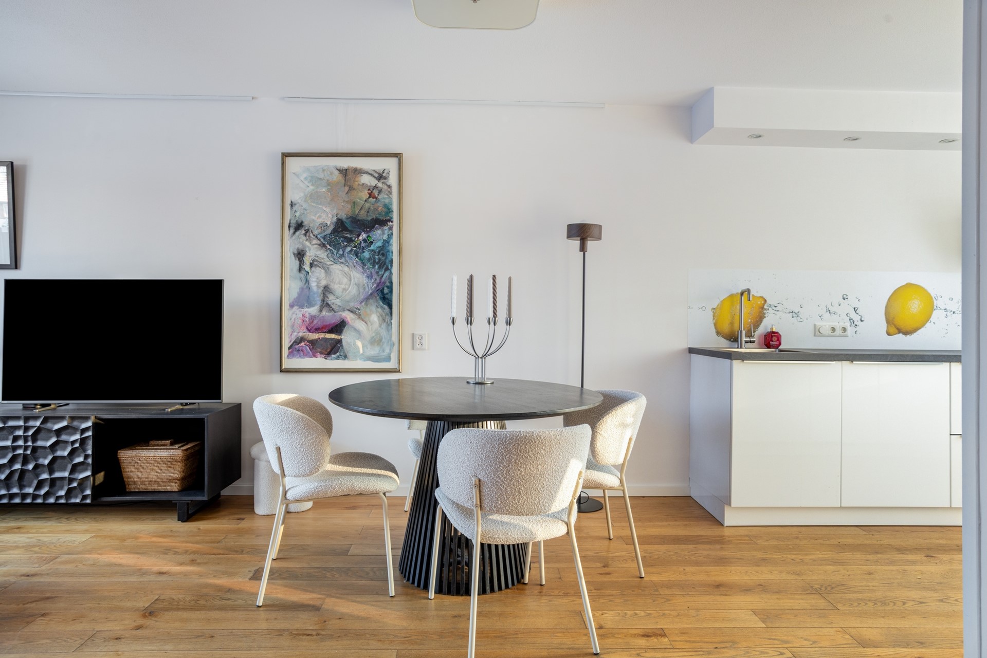 Keuken: Open keuken aan de voorzijde van de woning met een leuk uitzicht over de straat. Zo kun je de visite al aanzien komen tijdens het kokkerellen. De keuken heeft een doordachte opstelling met een apparatenwand en koffie-nis. Aan het kunststofwerkblad met enkele spoelbak is er veel werkruimte voor het bereiden van de maaltijden. De keuken is onder andere voorzien van: + 4-pits inductiekookplaat + Afzuigkap + Combimagnetron/Oven + Koel-/Vriescombinatie + Vaatwasser De ruimte is afgewerkt met een eikenhoutenvloer, gestuukte wanden en een spuitwerkplafond.
