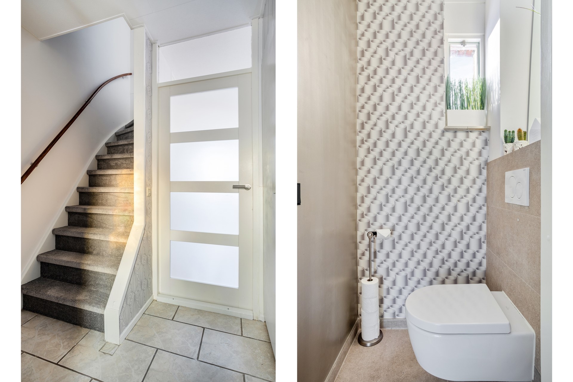 Toilet: Keurige toiletruimte waar via het vensterraampje het daglicht kan binnenstromen. Op het nisje kun je een leuk plantje plaatsen of een luchtverfrisser. De behangen wand is een leuk statement en het toilet is voorzien van een wandcloset. De ruimte is afgewerkt met een tegelvloer, deels betegeld en gestuukte wanden en een spuitwerk plafond.