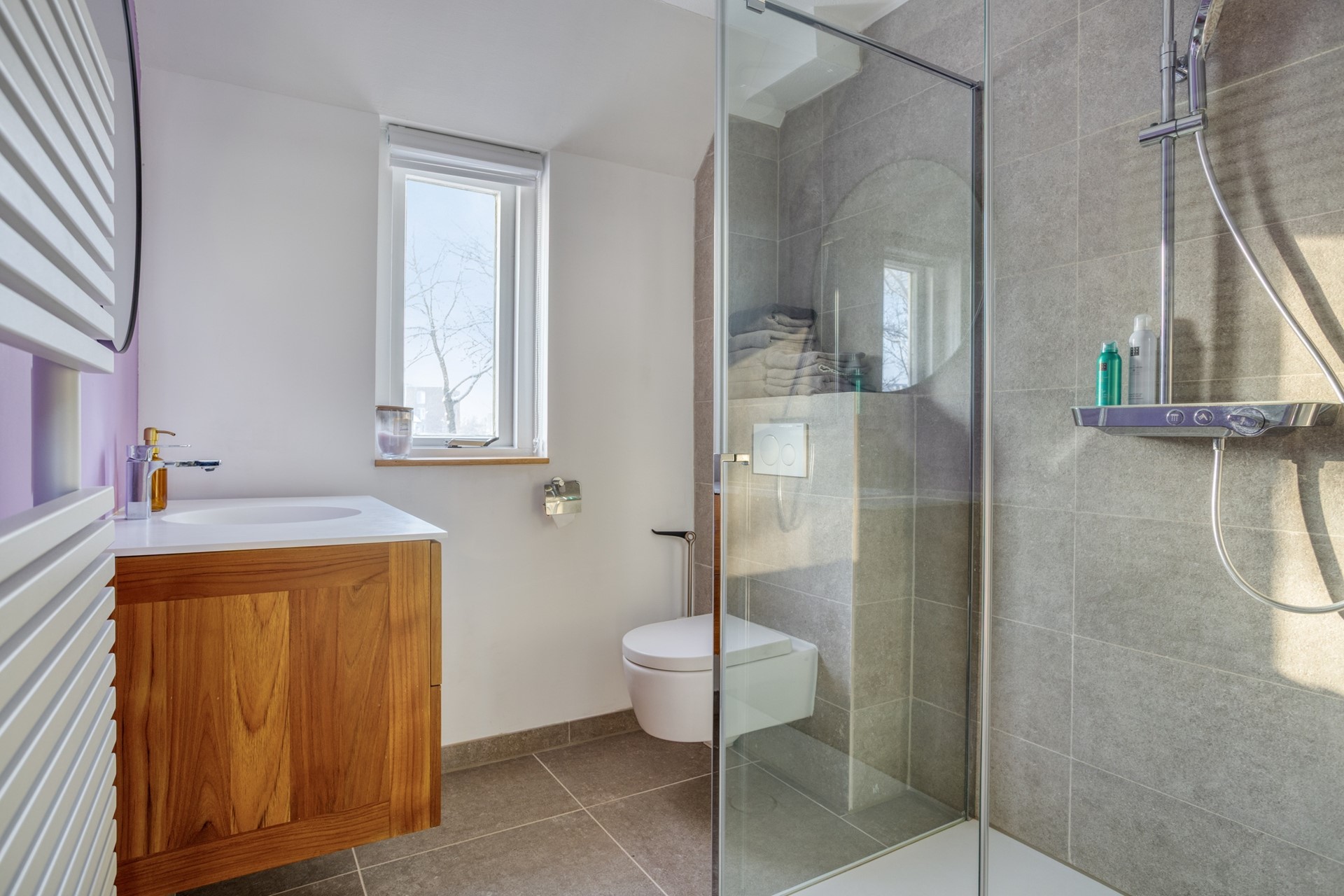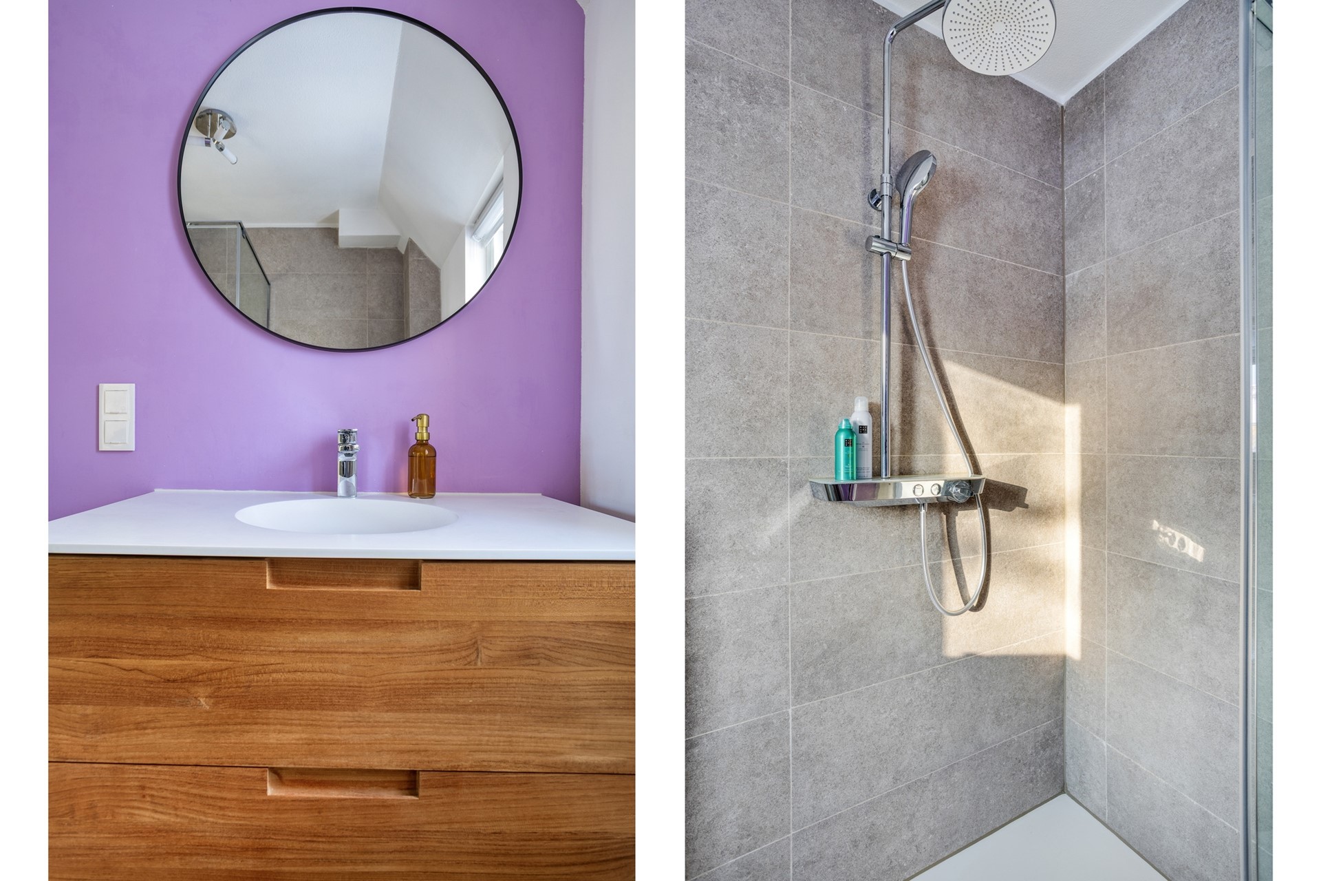 Badkamer: Strakke en sfeervolle badkamer. Een fijne plek om je in op te frissen. Het daglicht komt goed binnen via het raam, waarmee je ook de ruimte op natuurlijke wijze kunt ventileren. Koude voeten zul je niet krijgen door de aanwezige vloerverwarming. Mooi en leuk detail is de Van Gogh roze wand. Wil je liever een ander kleurtje op de wand? Dan kan dat altijd: zo druk je vrij makkelijk je eigen stempel op de badkamer zonder deze te verbouwen. De badkamer is voorzien van: + Badkamermeubel met enkele wastafel + Douchecabine met regendouche + Handdoeken radiator + Vloerverwarming + Wandcloset De ruimte is afgewerkt met een tegelvloer, deels betegelde / gestuukte wanden en een spuitwerk plafond.